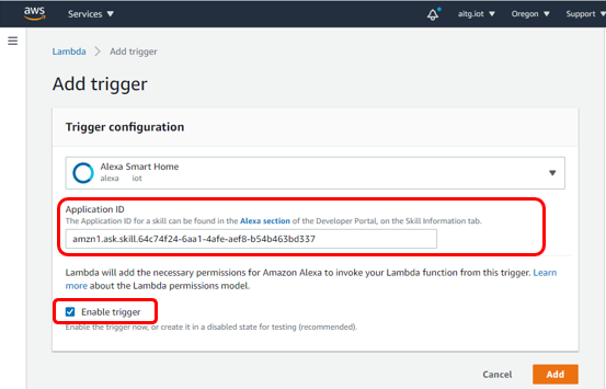 1. 點選” ADD Triggers” à點選“Trigger configuration” à選擇”Alexa Smart Home” à填入” Application Id”,這裡Application Id是步驟”Create the skill”” Your Skill ID” (AVS頁面中“Your Skill ID”)à勾選” Enable trigger” à 點選”Add” ( 282930)