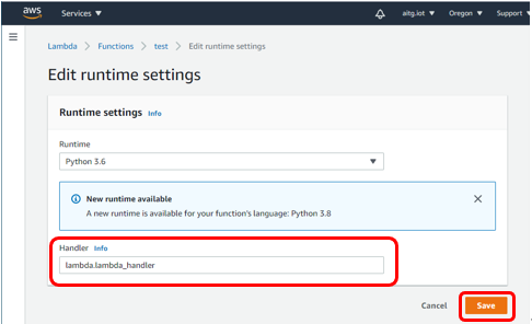 1. 點選” Runtime settings” à “Edit” à更改”Handler”lambda.lambda_handlerà點選“Save” ( 32)