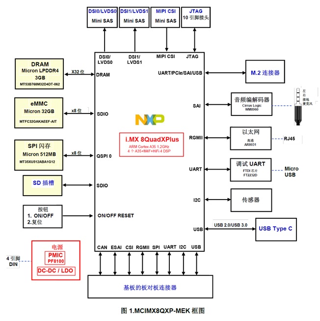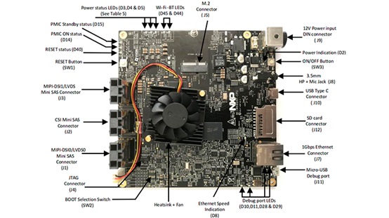 有關該處理器的更多詳細資訊,請參考www.nxp.com/imx8X上的資料手冊和參考手冊。開發板正面: