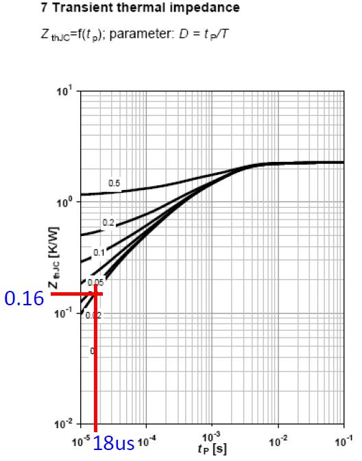 透過下列曲線求出暫態熱阻,Zthjc(18us) = 0.16K/W