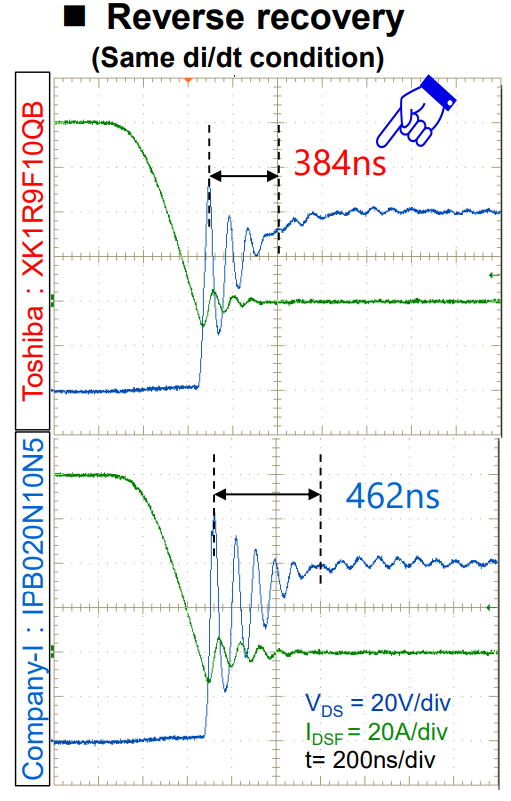 以下應用在power supply的初級側,與其他家相比可以看到VDS在spike差異甚大,也意味著EMI表現方便也會比較好