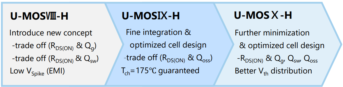 以下為東芝低壓MOSFET世代主要個別優勢及成長
