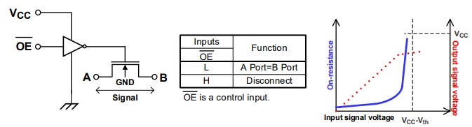 對於Nch MOSFET總線開關,電源電壓(VCC)在“導通”狀態下施加到MOSFET的開關。因此,輸入信號電壓將被偏置到交流或源極。