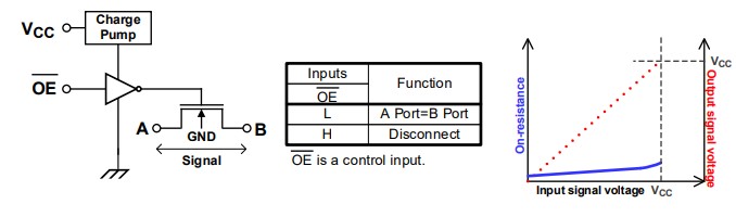 與並聯Nch / Pch MOSFET總線開關一樣,使用電荷泵的總線開關提供的輸出具有從0 V至VCC的全擺幅。這種類型的總線開關使用電荷泵(註1)來提高電源電壓,以保持nMOSFET的短路電壓,從而在整個輸入電壓範圍內保持其導通電阻。結果,總線開關呈現幾乎完全的 導通電阻與輸入電壓曲線。這將會輸入和輸出電壓可以從0 V擺動到VCC。