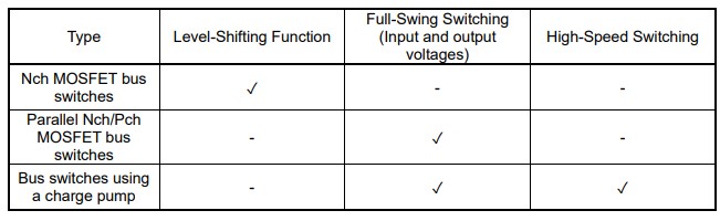 如表1.2所示,共有三種類型的總線開關:n串聯MOSFET(Nch MOSFET)總線開關,由並聯的n串聯和p串聯MOSFET組成的總線開關以及使用串聯泵的總線開關。這些總線 開關在內部開關的配置方面有所不同,並且需要不同的電源電路。