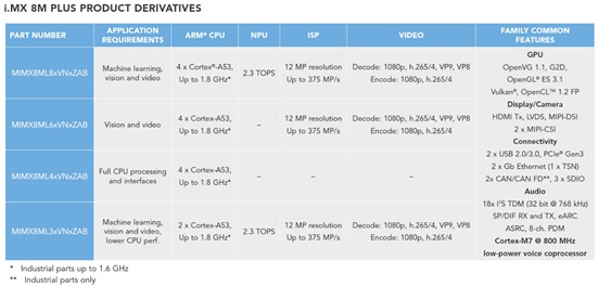 iMX8M plus與其他iMX8M系列產品不同的地方主要在增加了主頻為1.8GHZ,M7 800MHZ, 2.3TOPS NPU, 2xISP 12MP,HDMI TX,LVDS,2xUSB2.0/3.0 TYPE C, PCIE Gen3,2xGb with one TSN, 2xCAN/CAN FD and 15x15 mm 0.5Pitch package.