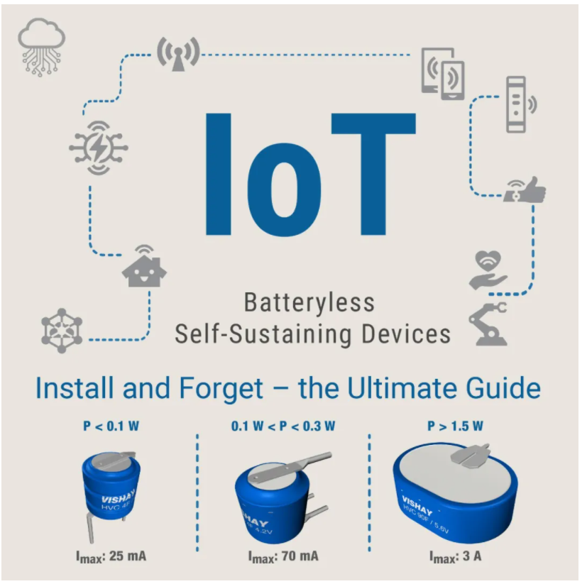 Vishay 正在物聯網領域確立新標杆。這一目標通過光伏能量收集等技術以及混合超級電容器而實現。能量收集是指將周圍能量源的少量能量收集起來,例如光、熱、振動或其他不同數量的能量。在這個領域,主要問題在於最高效的收集,將收集的能力有效地轉換為可用電壓水平以及無損存儲。具有最小洩漏電流的存儲電容器是實現這一點的關鍵組件。