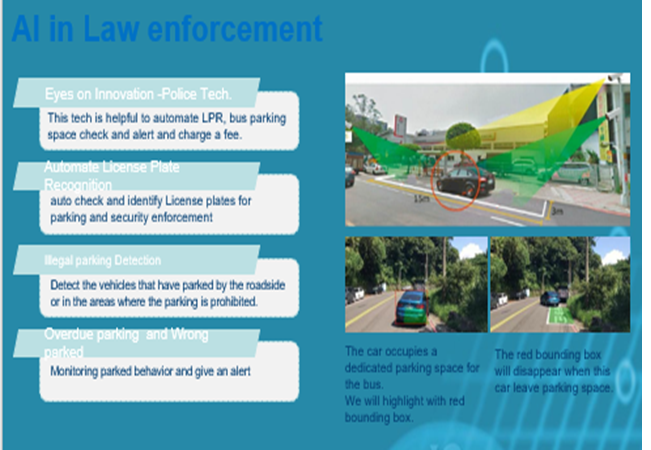 方面主要針對台灣擁擠的交通以及治安問題希望能提供具體的法規執行,用以節省人力資源,改善交通亂象以及維護道路用路人安全。 目前已具備有區間測速、紅線違停、闖紅燈、車牌辨識及AR眼鏡臨檢等項目。