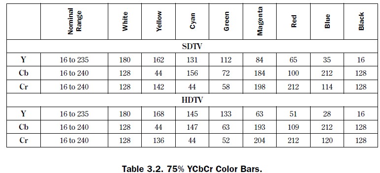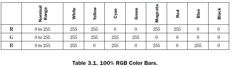 color space是一组颜色的数学表示,红、绿、蓝(RGB)颜色空间广泛用于计算机图形和显示器。红色、绿色和蓝色是三种主要的附加色(将各个组件添加在一起以形成所需的颜色),并由三维笛卡尔坐标系表示(图Figure3).立方体的指示对角线(每个主成分的数量相等)表示各种灰度。表Table3.1包含100%振幅、100%饱和色条(一种常见视频测试信号)的RGB值。