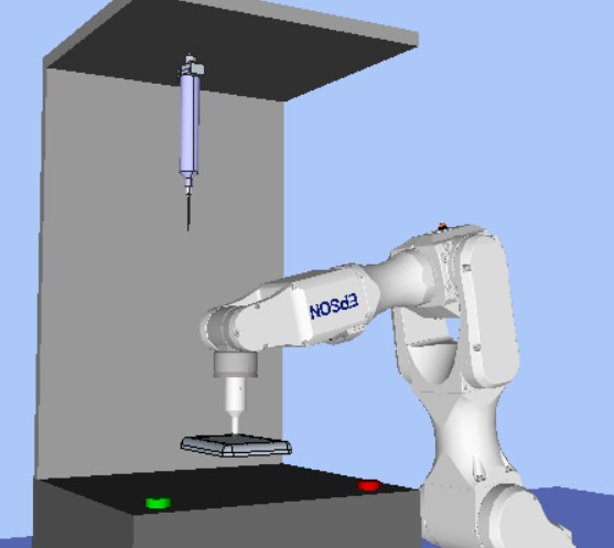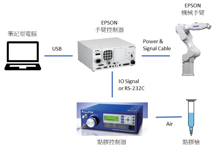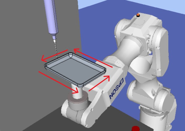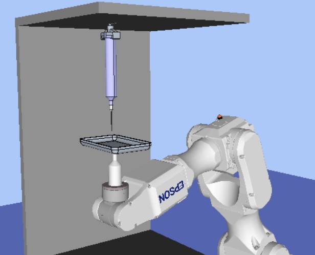點膠製程最早都是由作業員手持點膠槍進行手工點膠,而工廠再導入自動化後,也開始有機械手臂或是三軸機來帶動點膠槍,而現在EPSON有另外一種進階方案-外部座標參考點移動,此方案可以將點膠槍固定在機台上,而機械手臂抓取工件來進行點膠,點膠完成後機械手臂在將工件擺放到下一個工作站,這讓機械手臂可整合工件上下料及自動點膠兩個工作的內容,提升了此機械手臂的稼動率進而加速設備成本回收的時間。