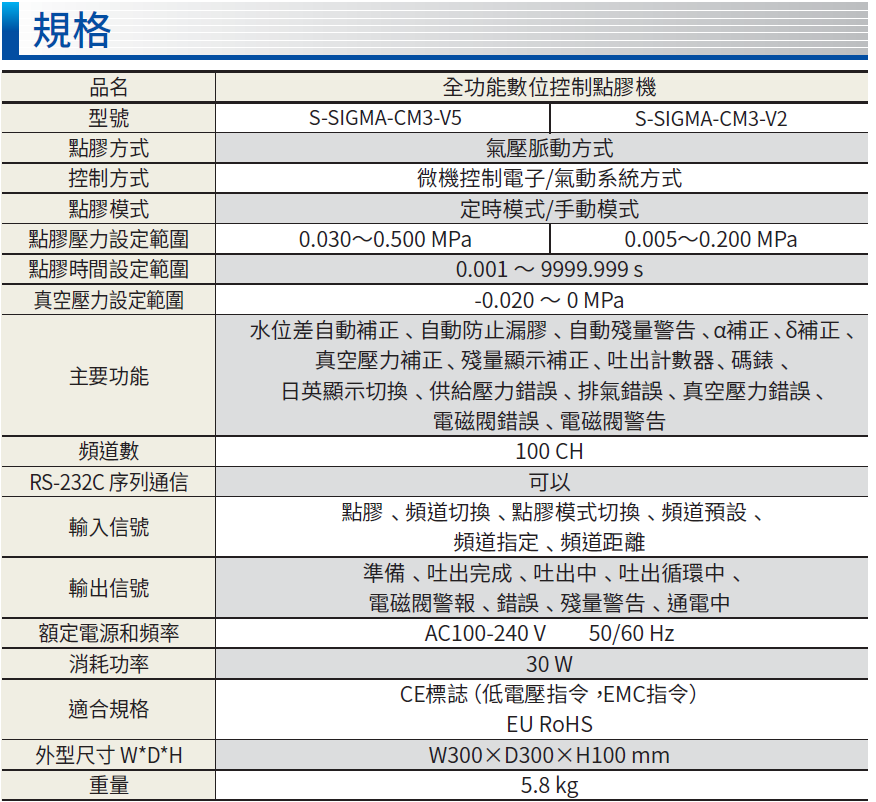 以下為日商武藏(MUSASHI)的點膠較高階的控制器為範例,可看到此機種的主要功能除了點膠補正外,也會提供相關錯誤或是警示訊息來讓機械手臂知道目前的狀況,但如果因為成本考量,也有對應的基本款機種可做選用。