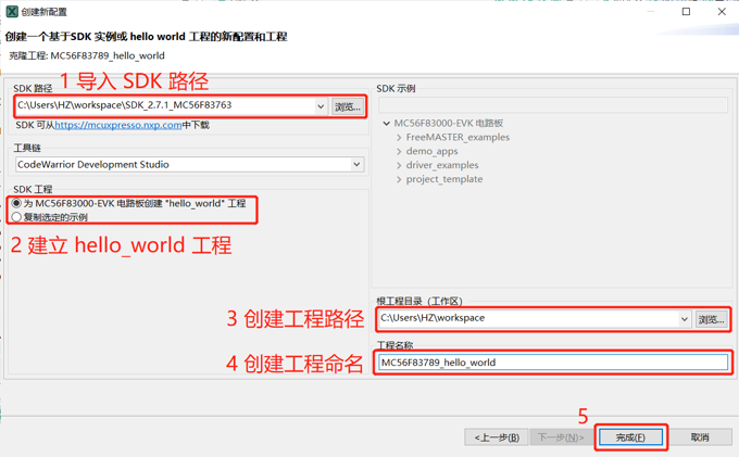 Step2:导入 SDK 路径 --->选择 hello world 工程--->选择创建工程路径 --->创建工程名称。(推荐创建工程路径选择 workspace )
