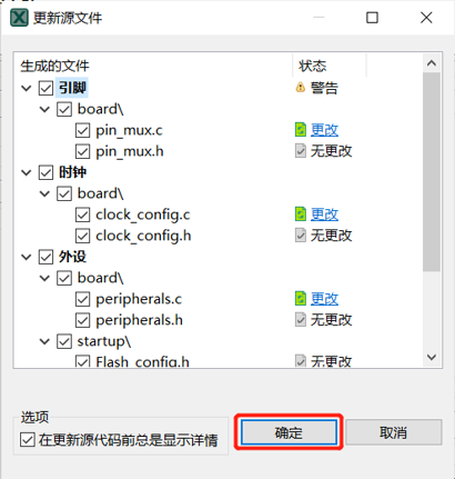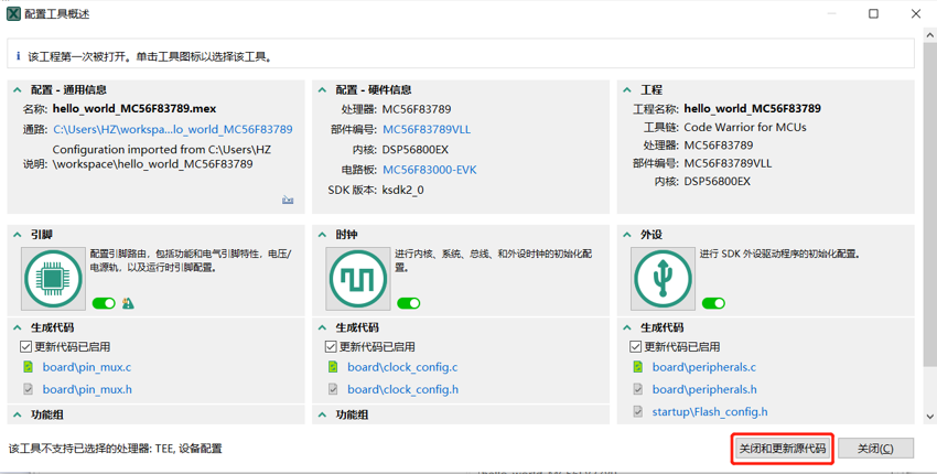 Step3:默认选择 引脚、时钟、外设 工具,选择 关闭和更新源代码。