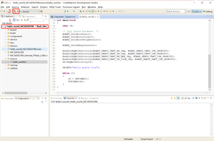 Step1:导入 hello_world 工程到 CodeWarrior 中,然后编译此工程。