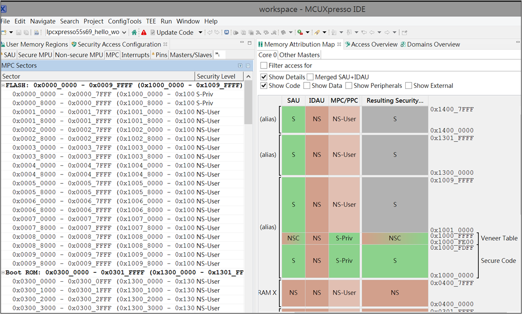在 TEE ( Trusted Execution Environment ) 工具中,您可以配置記憶體區域、bus masters 和 peripherals 的安全性策略,以隔離和保護應用程式的敏感區域。您可以在應用程式中設置應用程式不同部分的安全性策略。 Security Access Configuration 及其子視圖,於 Memory Attribution Map、Access Overview 及 Domains Overview views 中查看這些策略。使用 User Memory Regions view 創建記憶體區域及其 security level 的快速概覽。