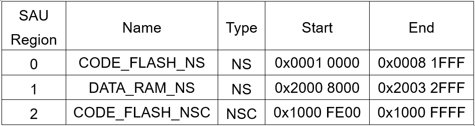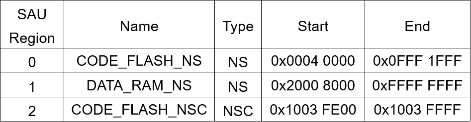 SAU 允許 8 個記憶體區域,並允許使用者覆蓋 IDAU 的固定 Map,以定義 Non-secure 區域。預設情況下,所有記憶體都設置為安全。至少應使用一個 ASU descriptor 確保 IDAU 有效。如果 IDAU 或 SAU 標記一個區域,則該區域是 Secure 的。NSC 區域可以定義在 IDAU 的 NS 區域中。