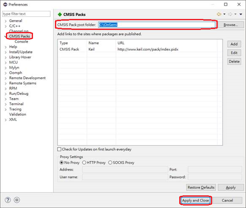 8. 在 Preferences 視窗左側中點選 CMSIS Packs ,在 CMSIS Pack root folder 中選擇你要安裝 CMSIS-Packs 的位置,如 C:\OnSemi ,選擇完畢後 點選 Apply and Close。
