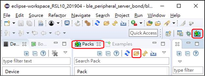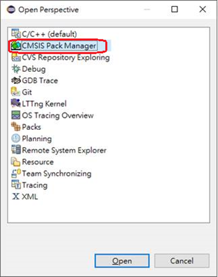 9. 點選右上角Open Perspective 圖案後點選 CMSIS Pack Manager 。