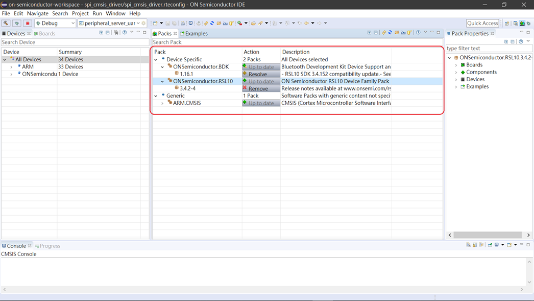 12. RSL10 CMSIS-Pack 至目前為止已安裝置 IDE 中 ,在 Devices 分頁中你可以展開所有 Devices > ONSemiconductor > RSL10 Series 中 RSL10 清單 ,你可以在 Packs 分頁中管理你安裝的 Packs。