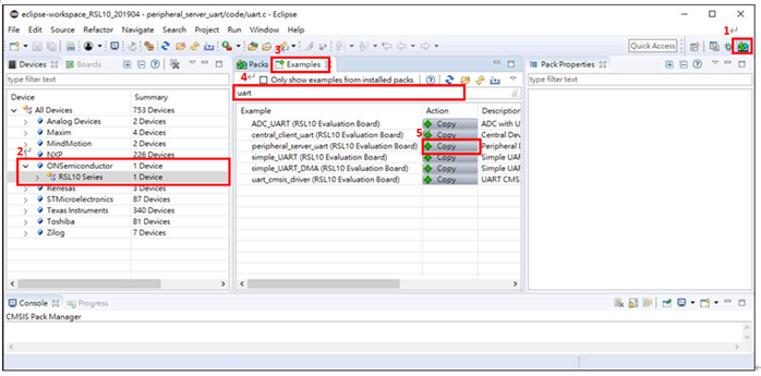 切換 CMSIS Pack Manager 頁面,點選 OnSemiconductor ,切換到 examples ,在搜尋欄輸入 uart ,選擇 peripheral_server_uart 後點選 copy