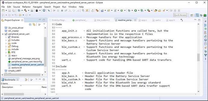 回到 C/C++ 分頁上,可在 Project Explorer 看到 peripheral_server_uart 已導入,展開資料夾可看到 readme_peripheral_server_uart,在這份文件中有此範例的說明