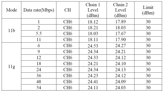 当IEEE 802.11b的数据速率为2Mbps, IEEE 802.11g的数据速率为6Mbps时,EUT的输出功率最大,所以所有的测试都在这个数据速率集中进行。