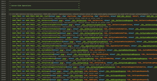 其中,onvif.h已不再需要,而nsmap檔案的內容是相同的,因此只需保留一個,後續程式中再include進去,其中在soapStub.h中定義了相關API的函式原型,需要開發者自行實作與設備間的資訊取得與設定,可搜尋Server-Side Operations區塊,下方所列出的就是在devicemanagement.wsdl與media.wsdl中所定義的API,此兩份文件約有170個API,開發者可根據要支援的profie增減相關的wsdl檔案