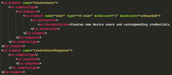 Web Service的描述,敘述服務的內容與說明如何與服務通信的XML語言,作用類似C語言的header檔案,下圖為ONVIF協議中新增設備使用者之API描述範例,定義了呼叫時需至少需要攜帶一個tt:User為參數。