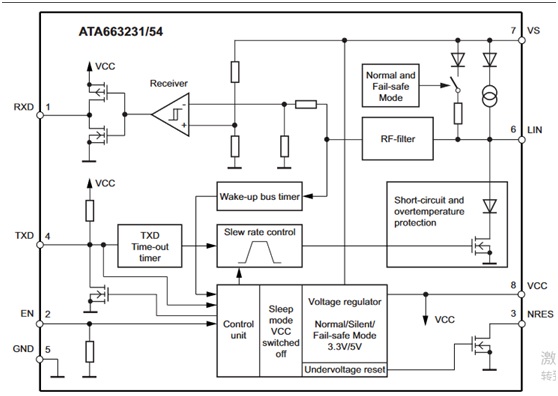 通過框圖可以了解到ATA663231/54,內部集成了一個可以對外部供電的LDO。這樣對於客戶的應用設計來說提供了很大的便利,由於ATA663231/54可以對外部提供3.3V/ 5V的電壓,因此客戶在使用ATA663231/54設計產品時候可以省掉一個LDO,從而對產品的體積縮減,採購成本的降低,都有益處。