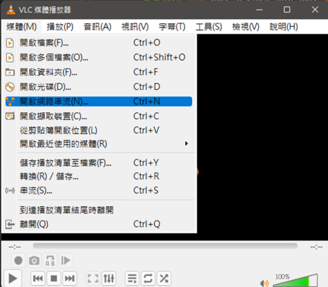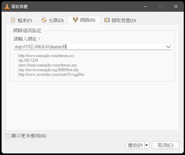 我們使用的用戶為VLC Media Player,執行後按下開啟網路串流的選項,就可以輸入伺服器端的資訊準備連線,設備預設的IP位址與RTSP的URL為rtsp://192.168.0.4/channel0