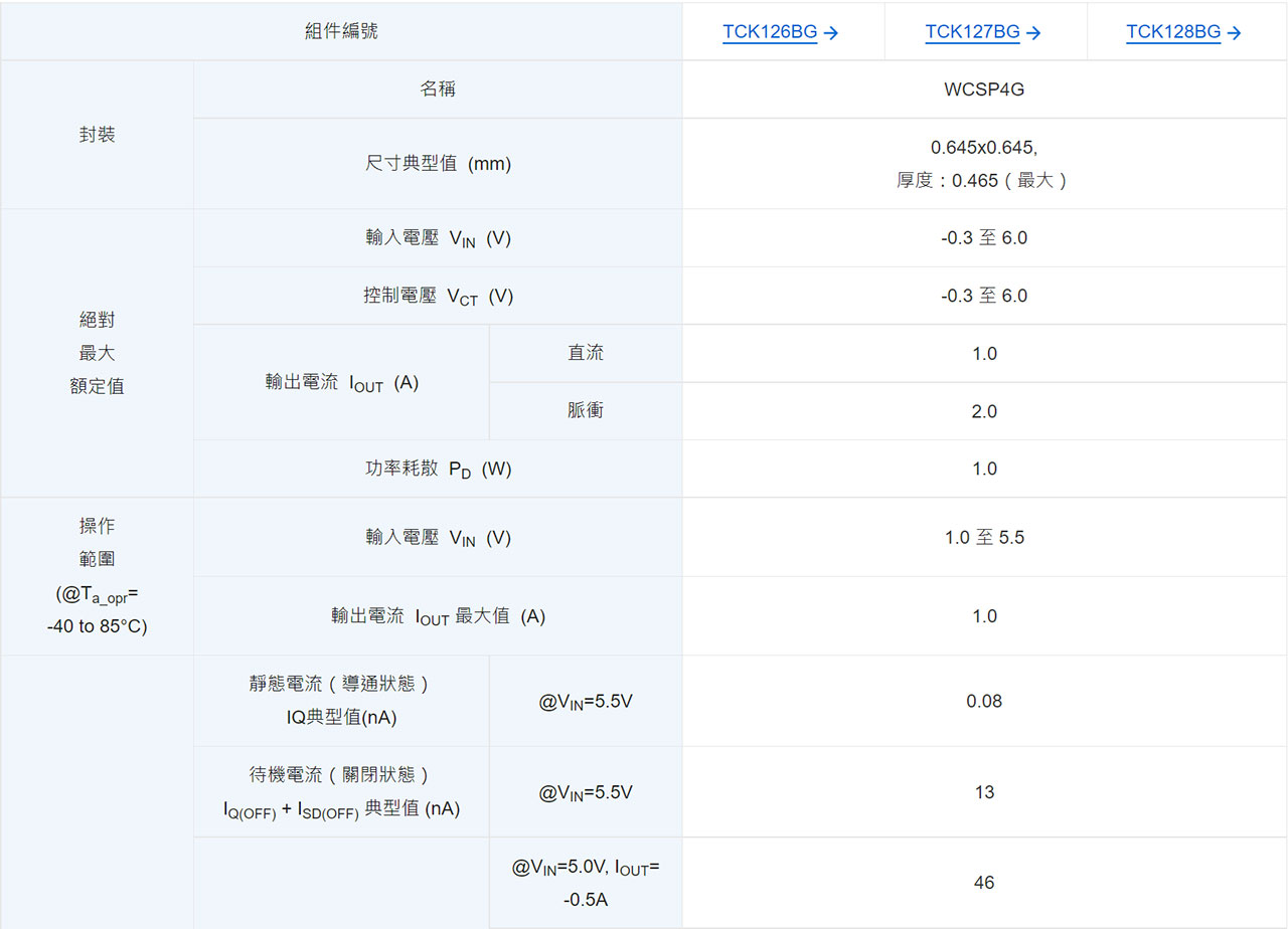 - 緊湊型WCSP4G封裝:0.645×0.645mm(典型值),厚度:0.465mm(最大值)