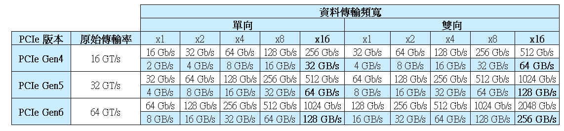 單向單通道的頻寬 = 16 GT/s x 128b / 130b = 16 Gb/s (Giga bits per second)