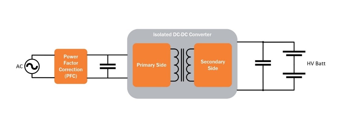 OBC有兩個主要功率級。首先,功率因素校正(PFC)級,保持輸入電流和電壓之間的相位關係,最大限度地減少線路/電網電流的總諧波失真(THD)。這有助於減少任何浪費的無功功率,提高整體能效。