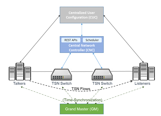 TSN 交換器及終端設備會定期向 Grand Master (GM) 進行時間同步、校正,使得網路中任兩個設備之間的時間誤差越低越好,一般標準的要求是時間誤差低於1微秒。CUC (Centralized User Configuration) 負責蒐集 「TSN 流量需求資訊」,再將這些資訊傳送給 CNC 以進行排程規劃,而 CNC 會在計算、確認流量的傳輸排程後,實際將對應的網路資源組態設定佈署在TSN交換器上。由於 CNC掌握了TSN網路在物理上的規格、限制,以及描述流量特性的足夠資訊,使得CNC有能力計算出可滿足流量低延遲需求的排程方案,甚至可讓特定流量端到端的延遲逼近物理上最低值(依網路規模而異,通常是數十至數百微秒)。