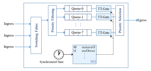 IEEE TSN工作小組為了實現、推廣TSN,到目前為止已制訂的相關標準有很多項目,而各家TSN交換器產品通常會選擇性地支援部份標準功能[2]。下表一簡要列出我們認為比較重要的幾項標準,其中 802.1AS及802.1Qbv可說是TSN交換器必備的功能。802.1AS 定義了交換器時間同步的機制,而802.1Qbv 則定義了交換器出口埠的佇列(queue) 封包排隊暫存及送出的機制—意即,運用經過精準校時的閘門開關(Time-Triggered Gate,TT-Gate),依據 CNC所設定的閘門控制列表(Gate-Control List,GCL)來照表按時開關特定佇列的閘門,使得特定佇列的封包會按照CNC所排程、設定於GCL的時間送出 (如圖2),因而實現標準所定義的「時間感知整流器」(Time-Aware Shaper,TAS)。