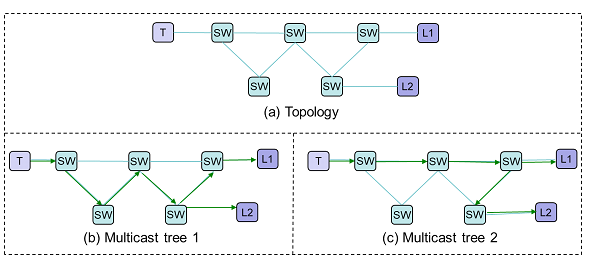 本團隊開發的第二個串流路由技術,目標是為了切合起初 802.1CB標準功能被提出的動機,使得「TSN網路所提供的複本備援傳輸效益可最大化」。針對有提出「複本備援需求」的TSN串流,此路由技術會依據串流發話端及各個收話端的位置,找出網路拓樸中可最大化互相備援的兩個樹狀傳輸路徑[3]。一個簡單的範例如圖3,可以看出當「任一條連接兩個交換器的鏈路」故障時,發話端與任一收話端之間至少存在一條路徑連接,通訊皆不會中斷。