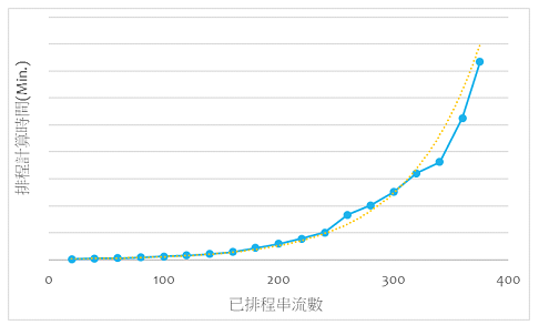 由虛線的趨勢線可觀察出,目前本團隊所開發的累加式排程器(incremental scheduler),所花費的計算時間與欲排程的串流數量大略會呈現一種指數型的成長關係。隨著拓樸的結構及TSN串流需求參數的不同,計算375條串流的排程通常需要數十至數百分鐘不等的時間。為了兼顧計算效能及盡可能滿足最多的TSN串流需求,實務上通常會需要調教一些演算法的超參數(hyper parameter),例如累加式排程在每個階段要考慮的stream數量,甚至有時需要調整網路拓樸的結構。