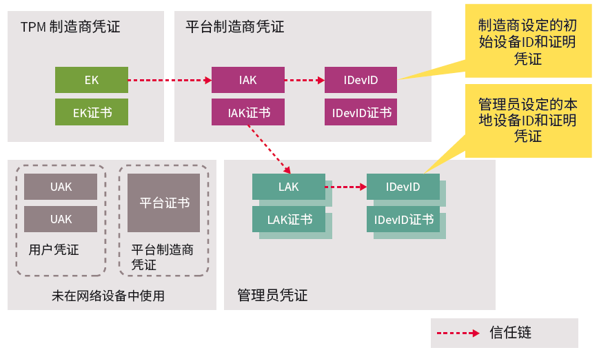 首先,在TPM內,英飛凌在每個 OPTIGA™ TPM 內都安裝了背書密鑰(EK)和EK證書。英飛凌出廠的每個OPTIGA™ TPM 都有一個單獨的背書私鑰、一個單獨的背書公鑰和一個由英飛凌簽署的個人EK證書,因此,可按照這一信任鏈來確認TPM是否有效。接下來,利用平台製造商的憑據,來證明指定TPM已安裝在特定類型的路由器或交換機中,有時可能還有序列號。這些憑據包括初始認證密鑰(IAK)和初始設備標識(IDevID)。將設備交付給客戶時,管理員可以(非必要)安裝公司憑證,如本地設備標識(LDevID)、本地認證密鑰(LAK)和相應的證書。