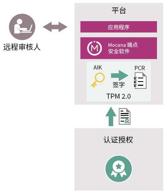 使用加密哈希值測量設備上的軟體。然後這些測量被擴展至TPM的平台配置寄存器(PCR),並在此安全儲存。遠程方希望獲得證明時,它便會將向設備發送質詢。設備上的軟體將此質詢發送給TPM,TPM會產生一個“Quote(引用)”,即質詢和當前PCR值的副本,且由TPM持有的證明身份密鑰(AIK)簽名。隨後,引用、受信任的CA頒發的AIK證書以及提供了設備加載軟體的完整性日誌將一起被發回服務器。接著,審核人會驗證這些內容,以確定能否接受設備上的軟體。在本地證明方面,可使用一個被稱作“sealing”的技術進行,並且可以以相同方式驗證設備配置。