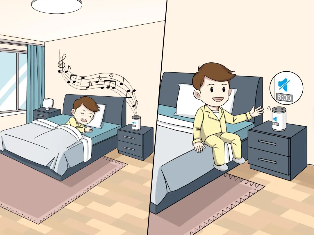 只見小凌左手打了個圈,床頭柜上的智能音箱便立刻停止了音樂的播放。