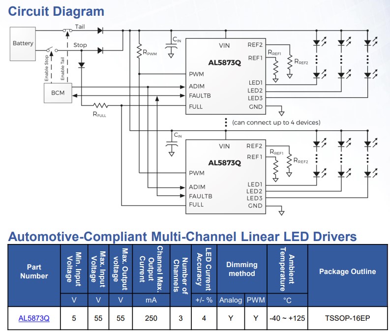 Diodes 公司的 AL5873Q 就是集成 LED 驅動器的一個例子。這是一款三通道線性 LED 驅動器,具有 5V 至 55V 的寬輸入電壓範圍,可提供可簡化車輛照明設計的多種功能。