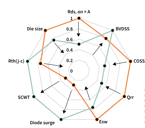 與任何半導體技術一樣,器件參數改進為一系列折衷的結果。圖10中所示的器件參數改進在理論上可實現,且隨著技術的不斷發展應能成為現實。並非所有的改進都是為了降低損耗,即便這也很重要。因為擊穿電壓更高而具有的堅固性,以及有助於簡化冷卻概念和提高可靠性的更低封裝熱阻,都是所需要的。封裝和SiC MOSFET單元設計也有改進空間,而這可能使得導通電阻RDS(ON)和裸片面積減小,從而能夠減小裸片電容和降低動態損耗。