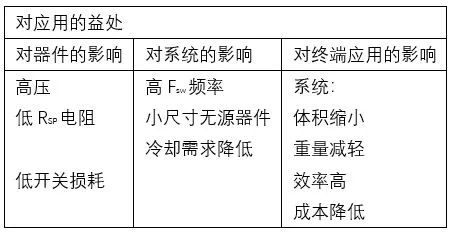 下表比較了矽和碳化矽的材料性能差異,以凸顯出這些差異體現在器件和系統中的益處。此外,該表還描述了SiC 在終端應用中能夠創造的價值。