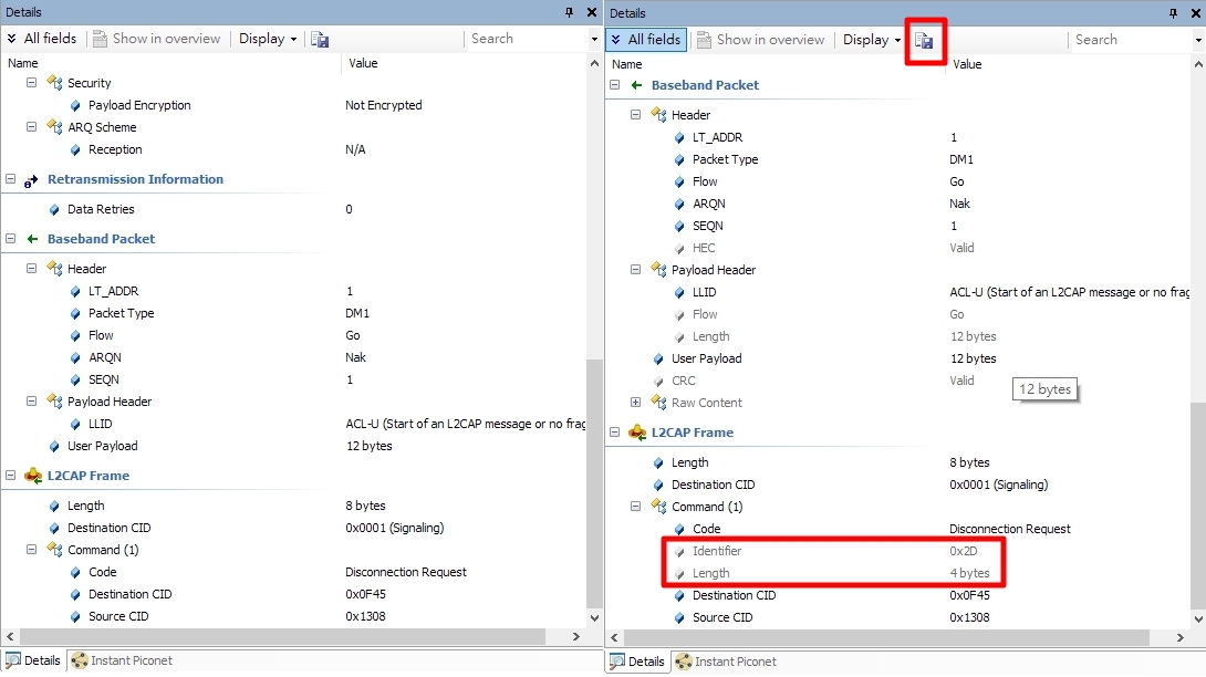 再來看B區,當我們點選A區的某個封包,B區的Details會顯示這個封包的所有詳細資料,All fields這個按鈕可以顯示一些隱藏的資訊,可經由下面左右兩張圖比較。另外你也可以把這個Details顯示的完整內容存成.txt檔案,只要按下Display右邊的存檔按鈕即可。