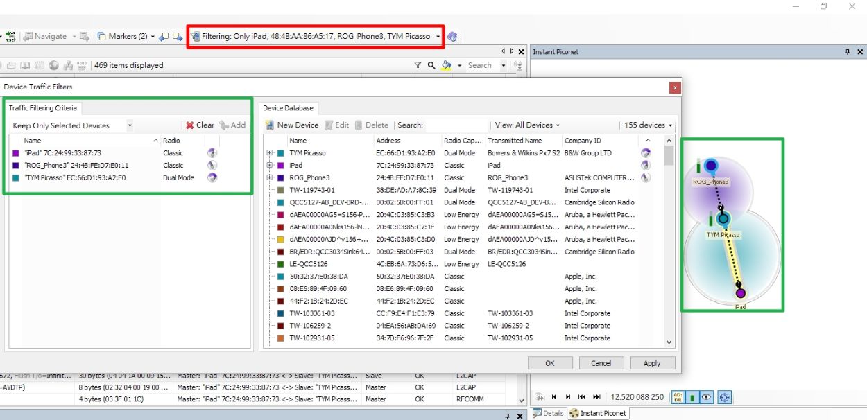 我們按下紅色框的Filtering按鈕,會跳出Device Traffic Filters的視窗如下,綠色框就是我們決定要抓取封包的裝置。在Instant Piconet裡面,會顯示出來,讓你確認儀器有沒有發現這些裝置。![]()