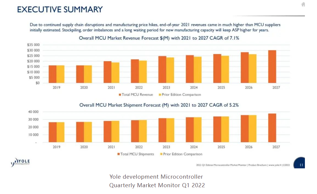 據 IoT Analytics 數據,2022年活躍連接的物聯網設備將達到144億,2025年將增長至270億。作為物聯設備中必不可少的控制與計算的大腦,MCU也將迎來持續增長。Yole最新數據顯示,2022年MCU的市場規模預計為200億美元以上,並且將保持7.1%年複合增長率,於2027年達到300億美元市場規模。