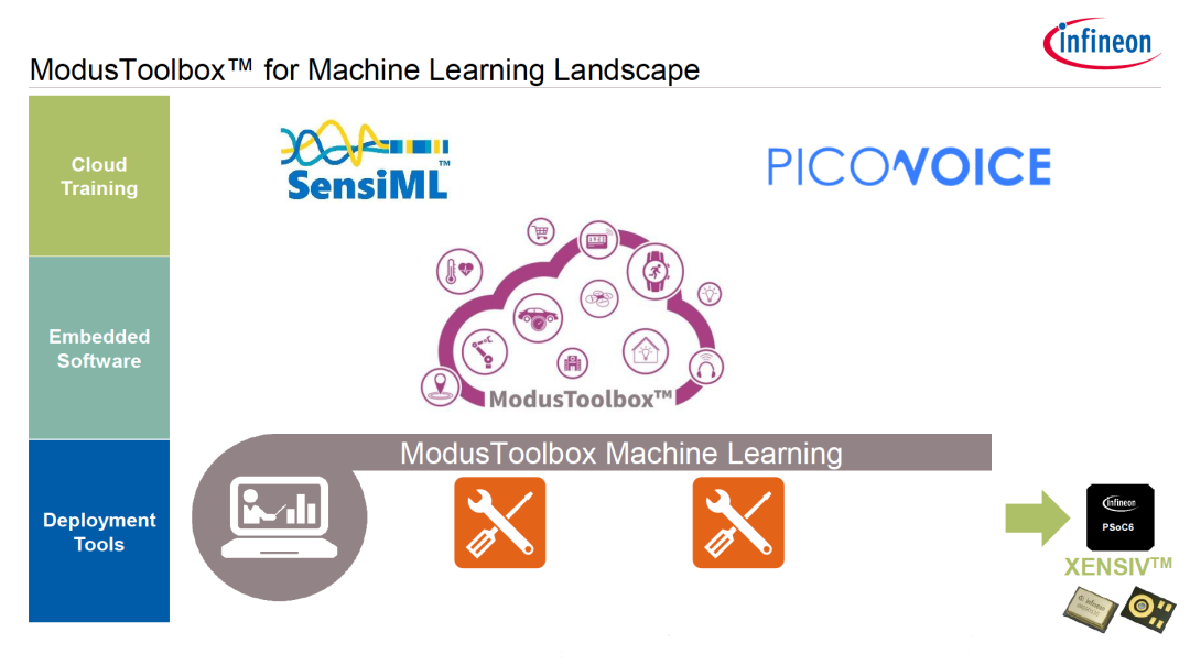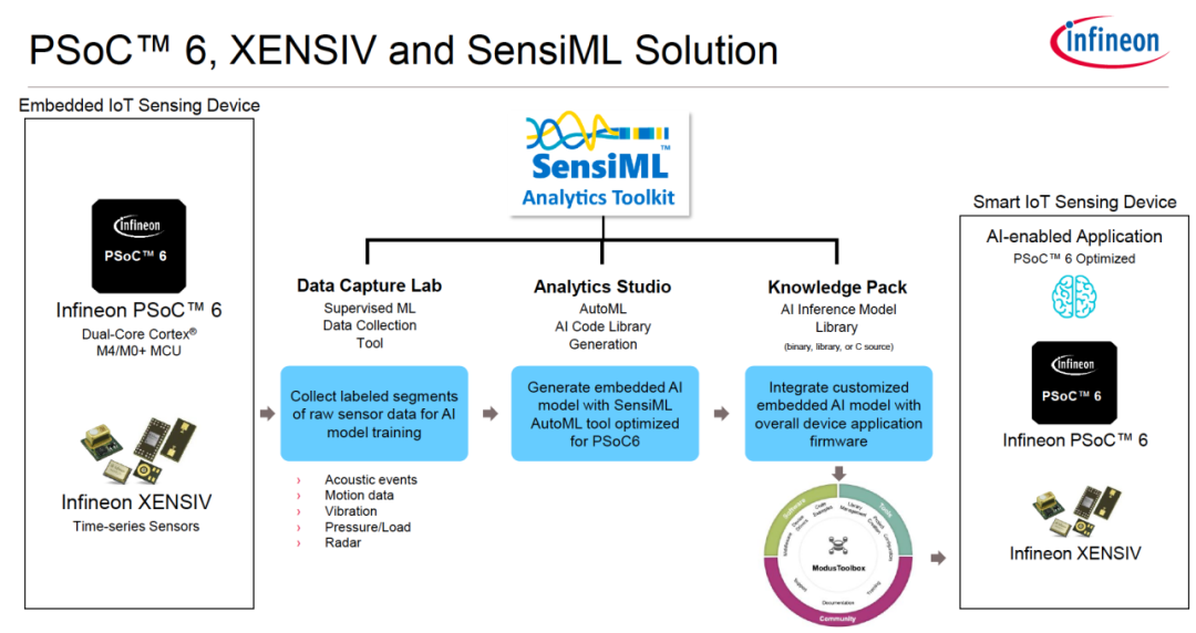 SensiML的Analystics Toolkit完善後導出ML模型,通過ModusToolbox將其部署到PSoC6和XENSIV的硬體平台上。