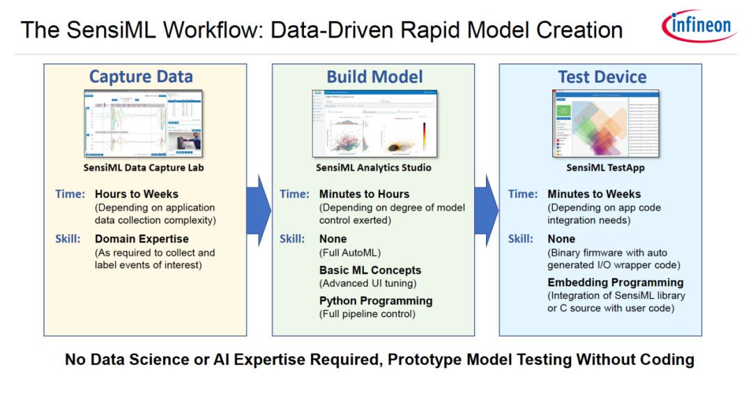 為了解決TinyML的應用難題,英飛凌與SensiML攜手一起構建了從雲端訓練、到嵌入式軟體開發、再到最終硬體部署的一套完整的邊緣側機器學習應用方案。