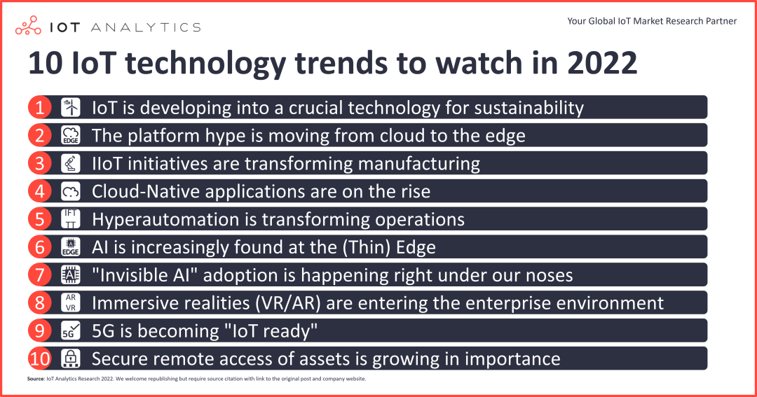 IoT Analytics總結了2022年物聯網的十大技術趨勢,其中提到:完備5G基礎設施將會加速IoT垂直領域應用發展;IoT將會改變製造業,並成為實現可持續發展的關鍵技術;雲平台商和IT廠商開始競逐邊緣端平台市場;AI變得無處不在,隱形AI在各行各業釋放潛能;AI的計算正在向著邊緣端拓展,實現端側部署。