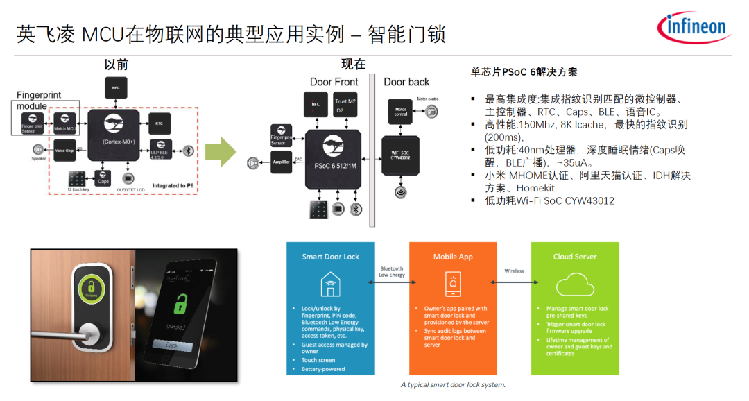 以上幾大特質融合在一起,讓PSoC6成為了IoT開發的利器。以智能門鎖應用為例,傳統方案需要將指紋識別、語音識別、觸控、無線連接等多個不同的晶片整合在一起構成一個系統方案;而現在一顆PSoC6就具備了這些功能,極大地簡化了開發流程,縮減了整體成本並提高了安全性。
